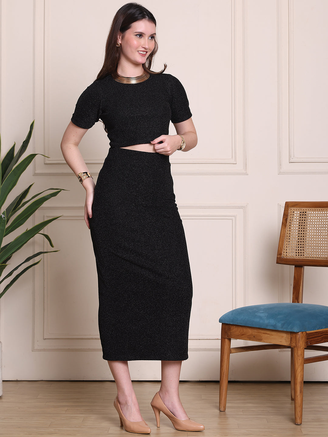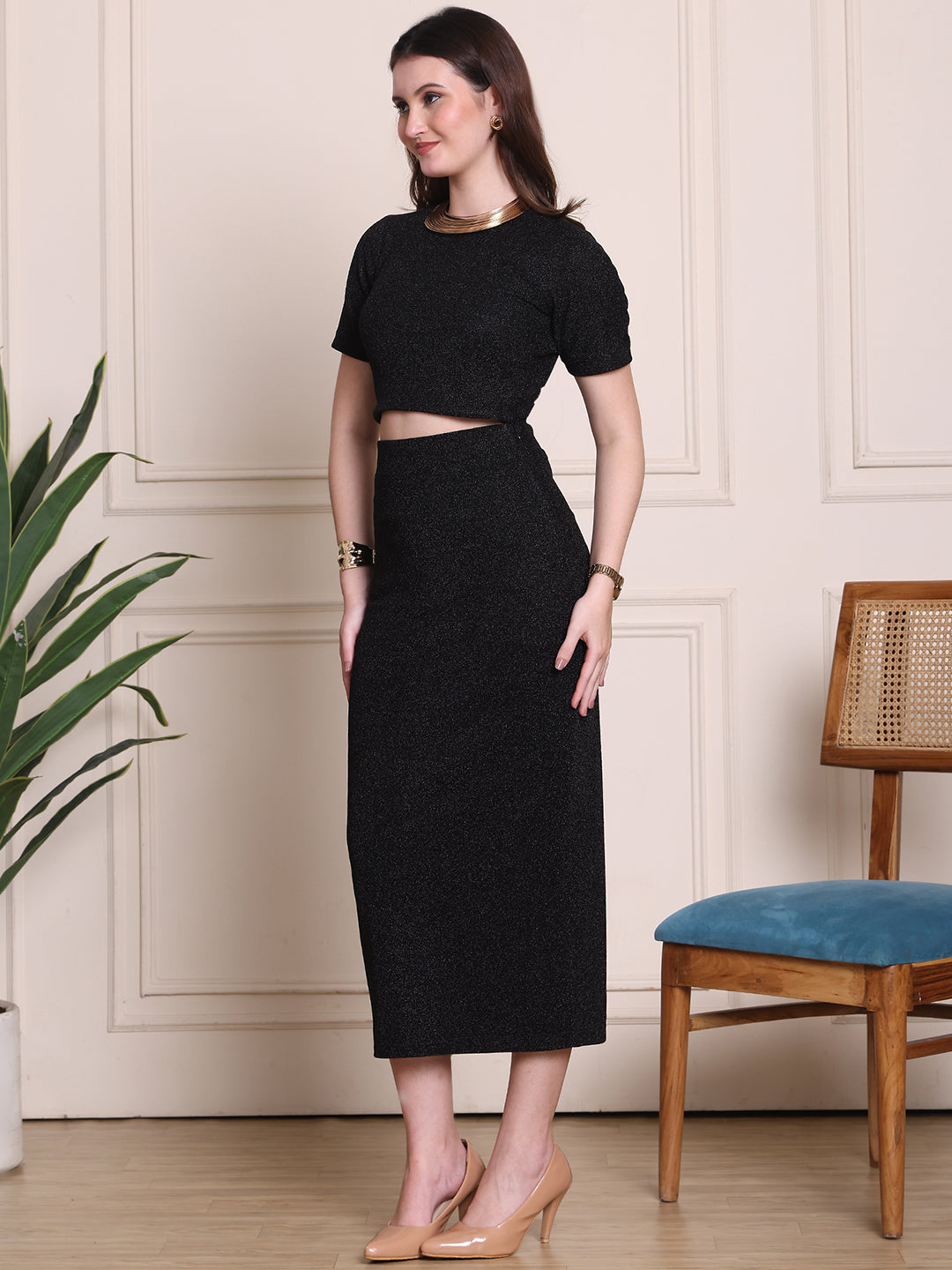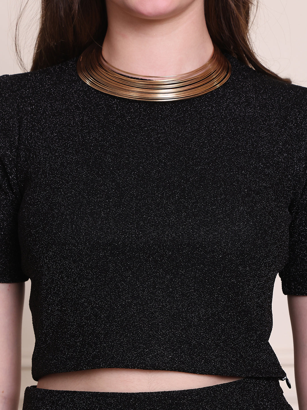 This glamorous two-piece co-ord set features a black glitter crop top paired with a chic midi skirt, creating a stunning, coordinated look. The shimmering glitter fabric adds a touch of sparkle and sophistication, perfect for a night out or special occasion. With a flattering fit and modern style, this set effortlessly blends elegance and boldness.