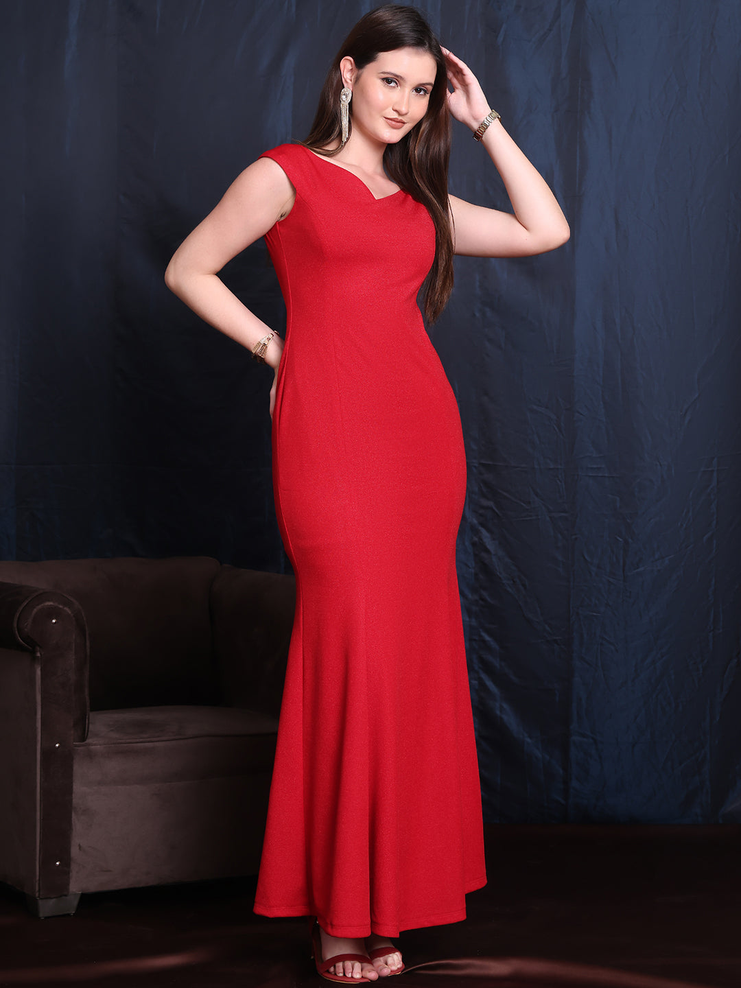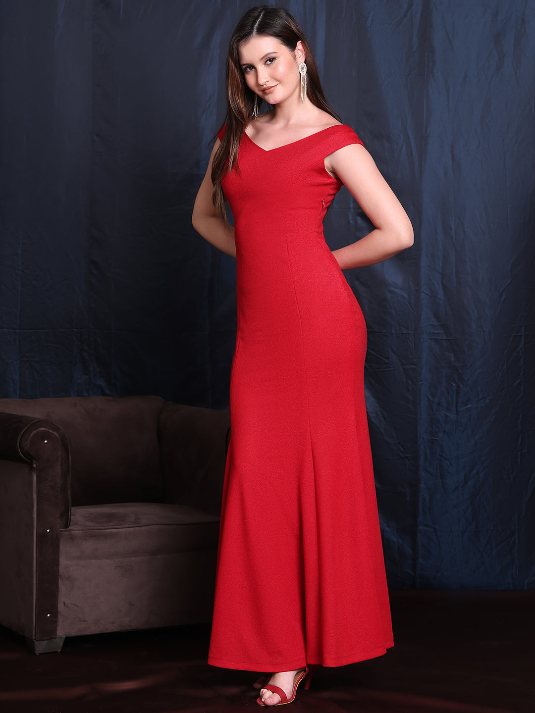 This elegant off-shoulder gown is crafted from premium imported fabric, offering a luxurious feel and natural stretch for ultimate comfort. The dress features intricate panel detailing that adds a sophisticated touch and enhances its flattering silhouette. Perfect for formal events, this gown combines style, comfort, and a timeless appeal