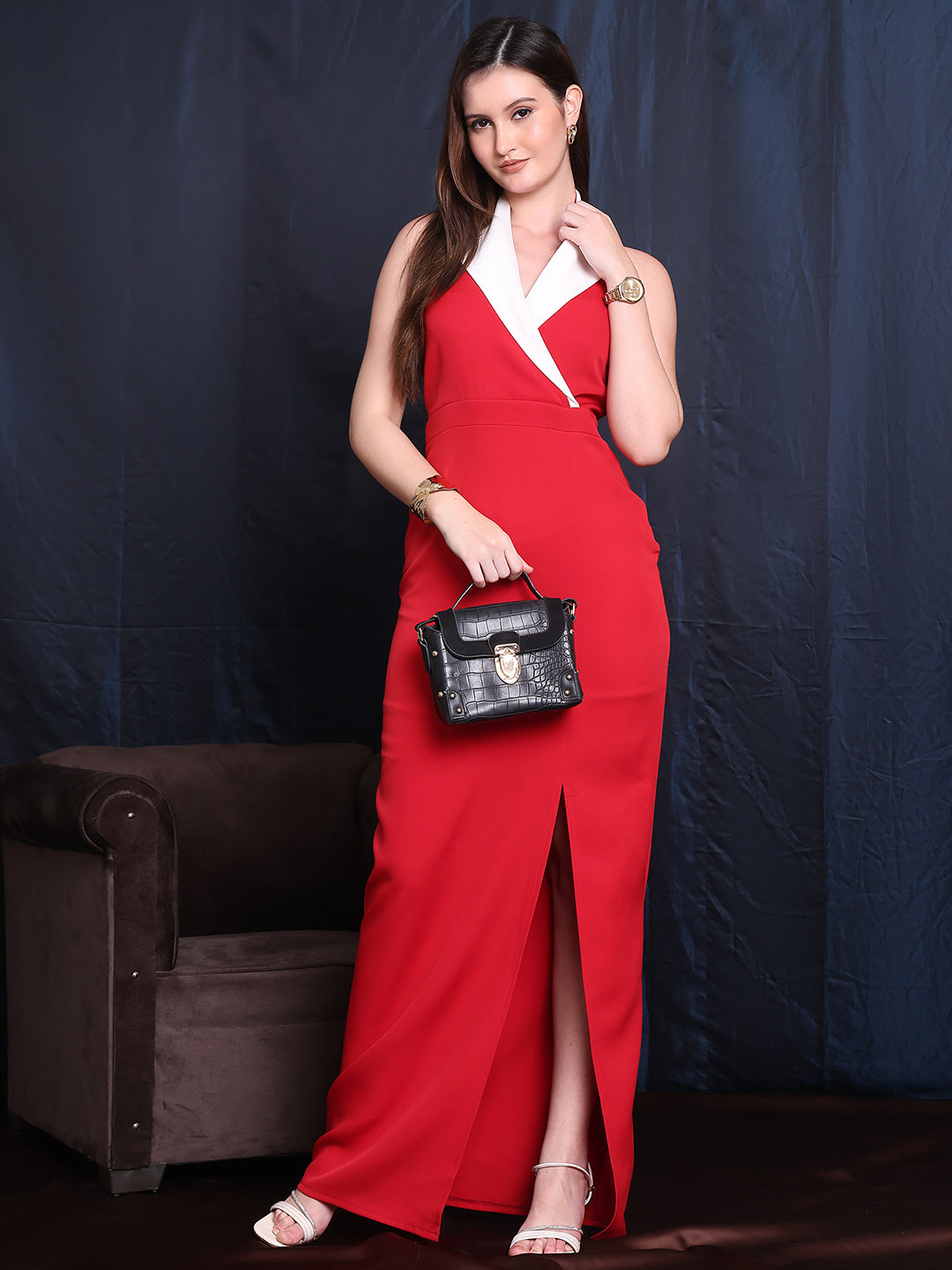This striking halter blazer-style gown combines bold sophistication with contemporary flair. Featuring a sleeveless design in vibrant red and white, the gown includes a front slit for a touch of allure. Crafted from premium fabric, it offers both comfort and style, making it the perfect choice for evening events and special occasions