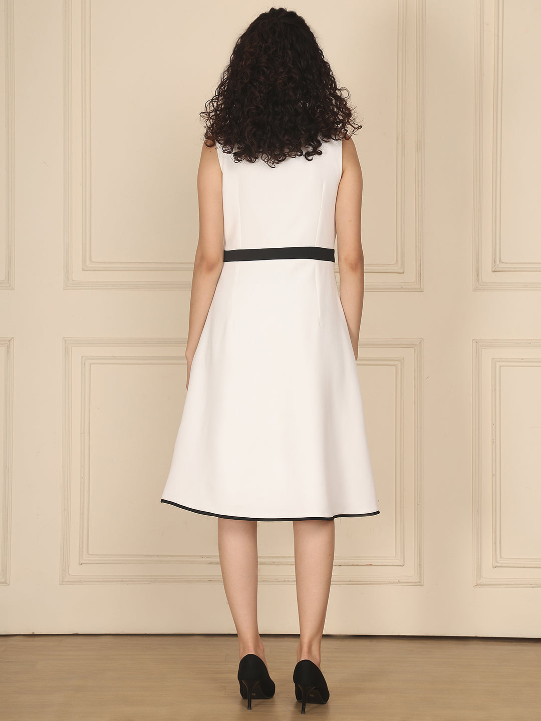 Sophisticated and striking, this white sleeveless A-line blazer dress blends sharp tailoring with feminine detail. Featuring a bold black collar, refined piping, and elegant pearl button accents, it offers a timeless monochrome look with a modern twist. Perfect for events, workwear, or statement day dressing—effortlessly polished, endlessly versatile.