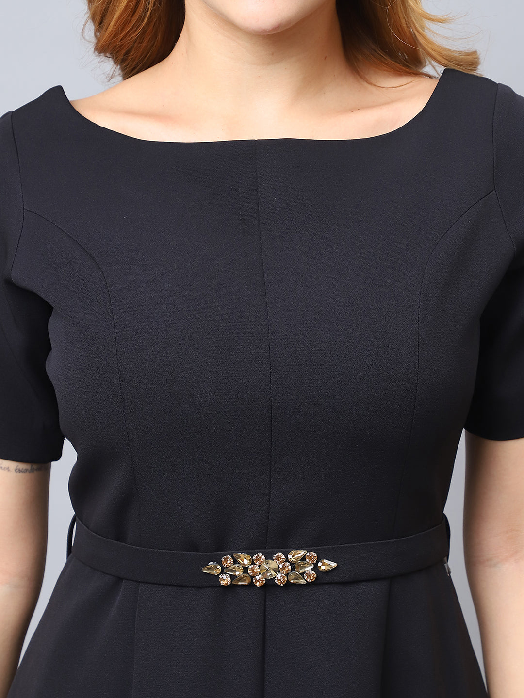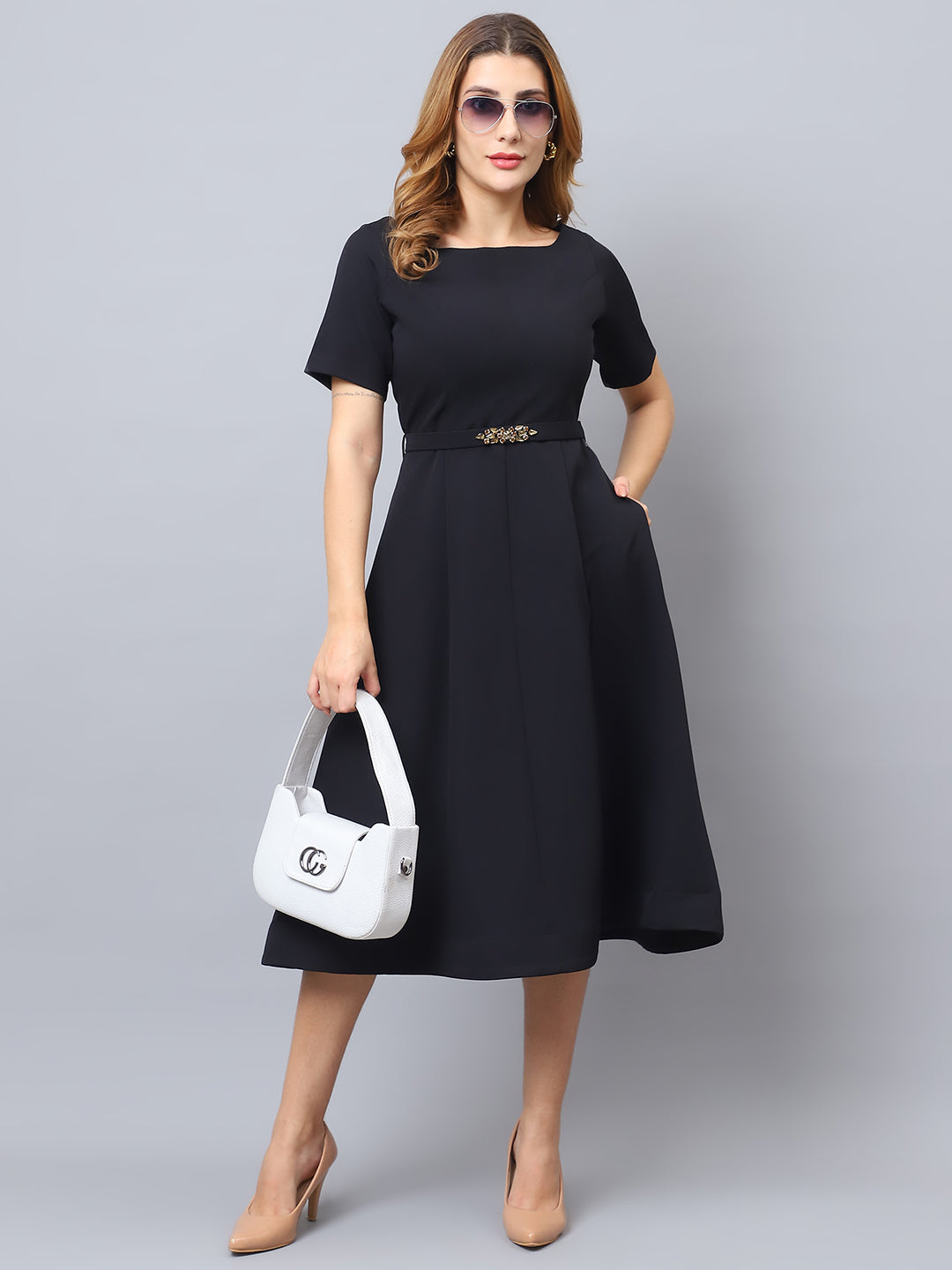Sleek and sophisticated, this black A-line dress features structured panel work on the skirt, crafted from premium fabric for a luxurious feel and elegant drape. A boat neckline and half sleeves add timeless charm, while an embellished belt highlights the waist. Finished with discreet side pockets, this dress combines beauty and function in every detail.