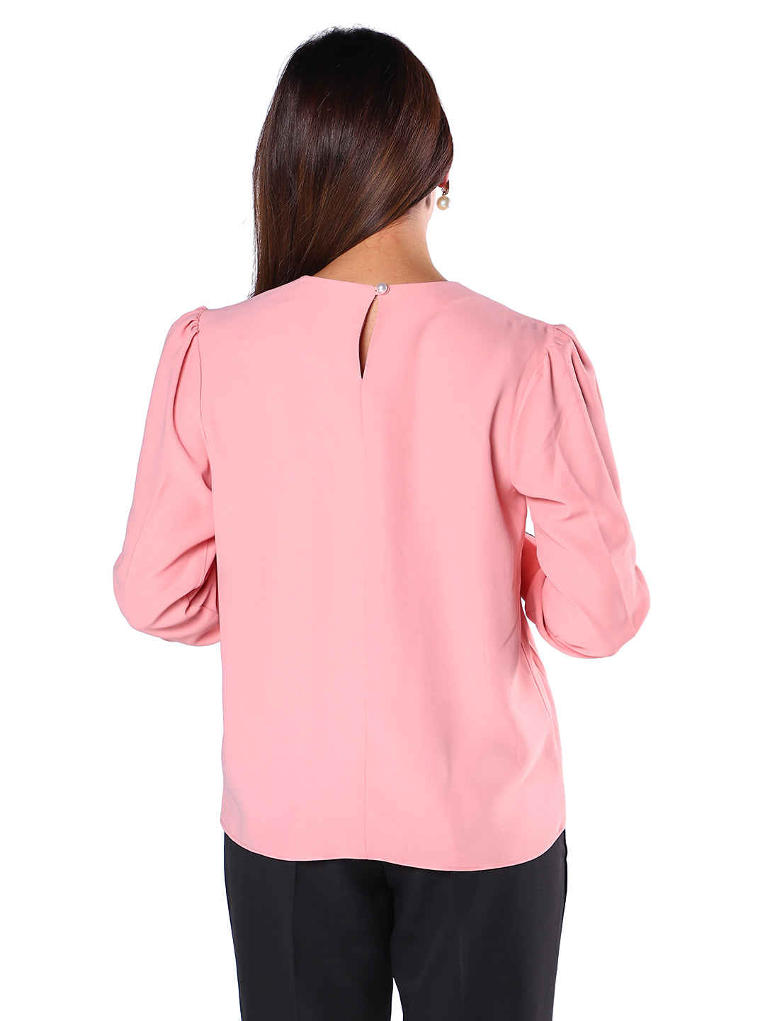 Add a touch of sophistication to your wardrobe with the Blush Pearl Accent Blouse. This soft pink long-sleeve shirt features delicate pearl accents along the neckline and cuffs, with subtle pleated details on the front for graceful movement. The relaxed fit and feminine hue make it perfect for office wear or special occasions. Pair with tailored pants or a pencil skirt for an effortlessly chic look.