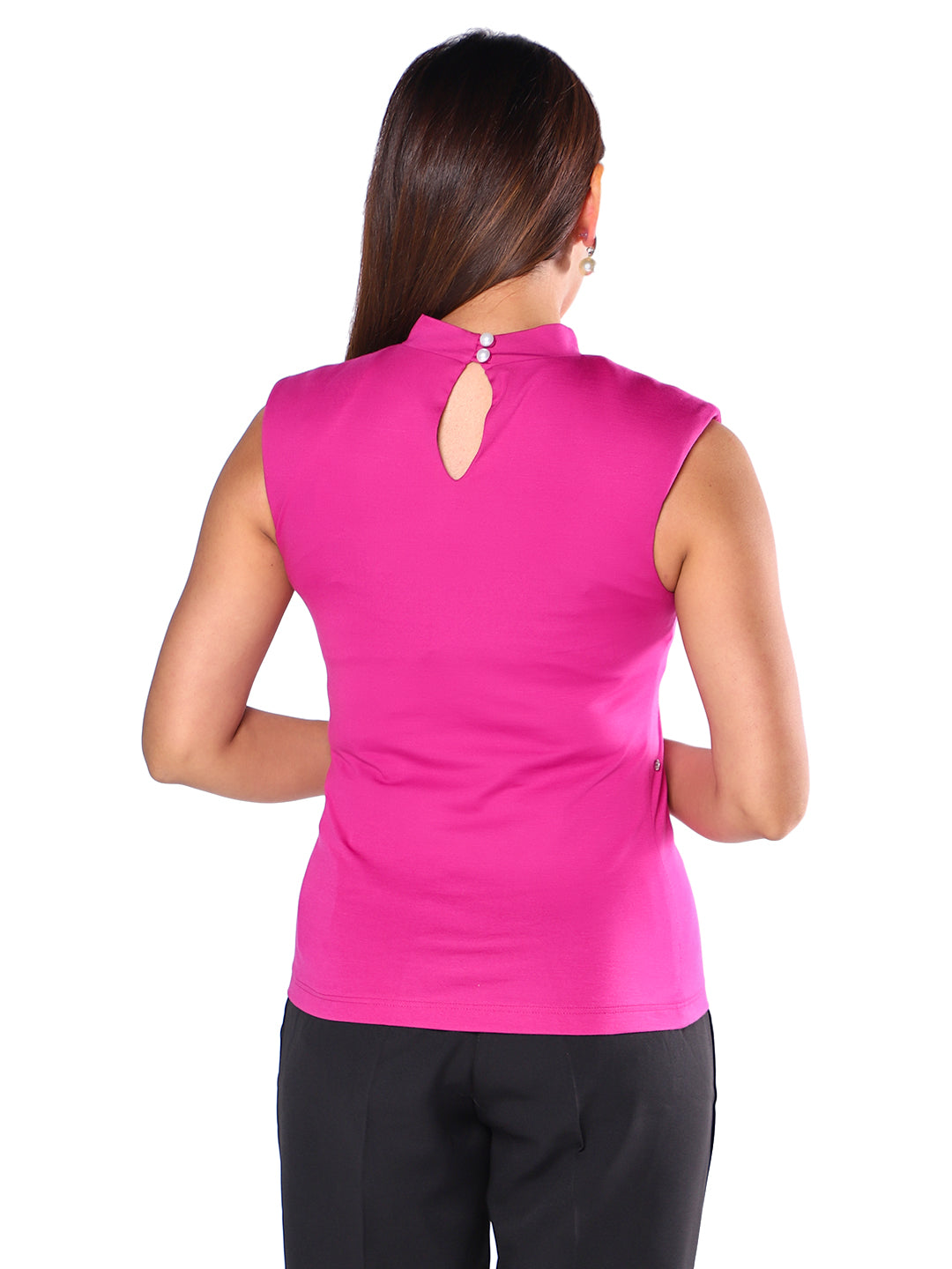 Brighten any look with the Fuchsia Gem Embellished Top. This sleeveless shirt, designed in a vibrant pink hue, features delicately spaced gem accents on the front for a touch of playful glamour. The mock neck and soft stretch fabric provide a flattering fit, making it perfect to pair with trousers, skirts, or jeans. Whether for office chic or weekend outings, this top brings a unique blend of comfort and elegance to everyday dressing.