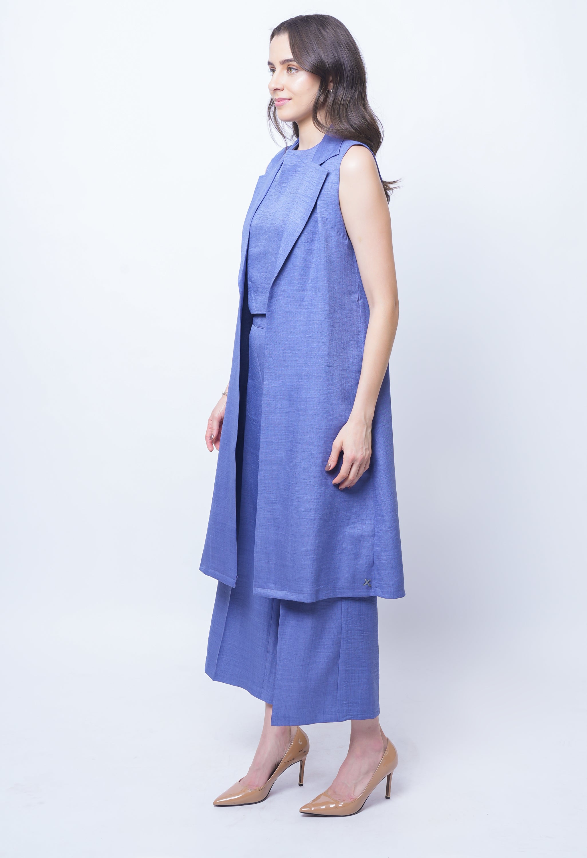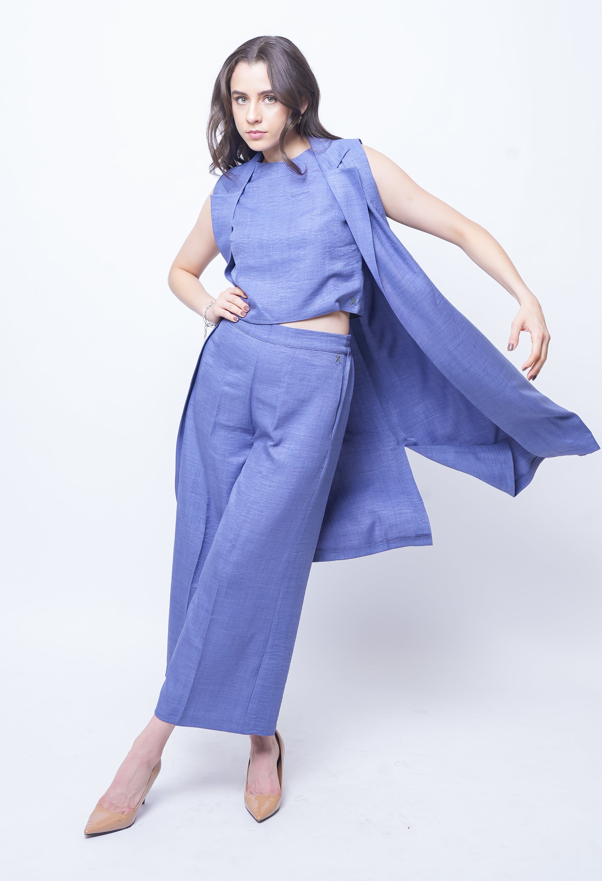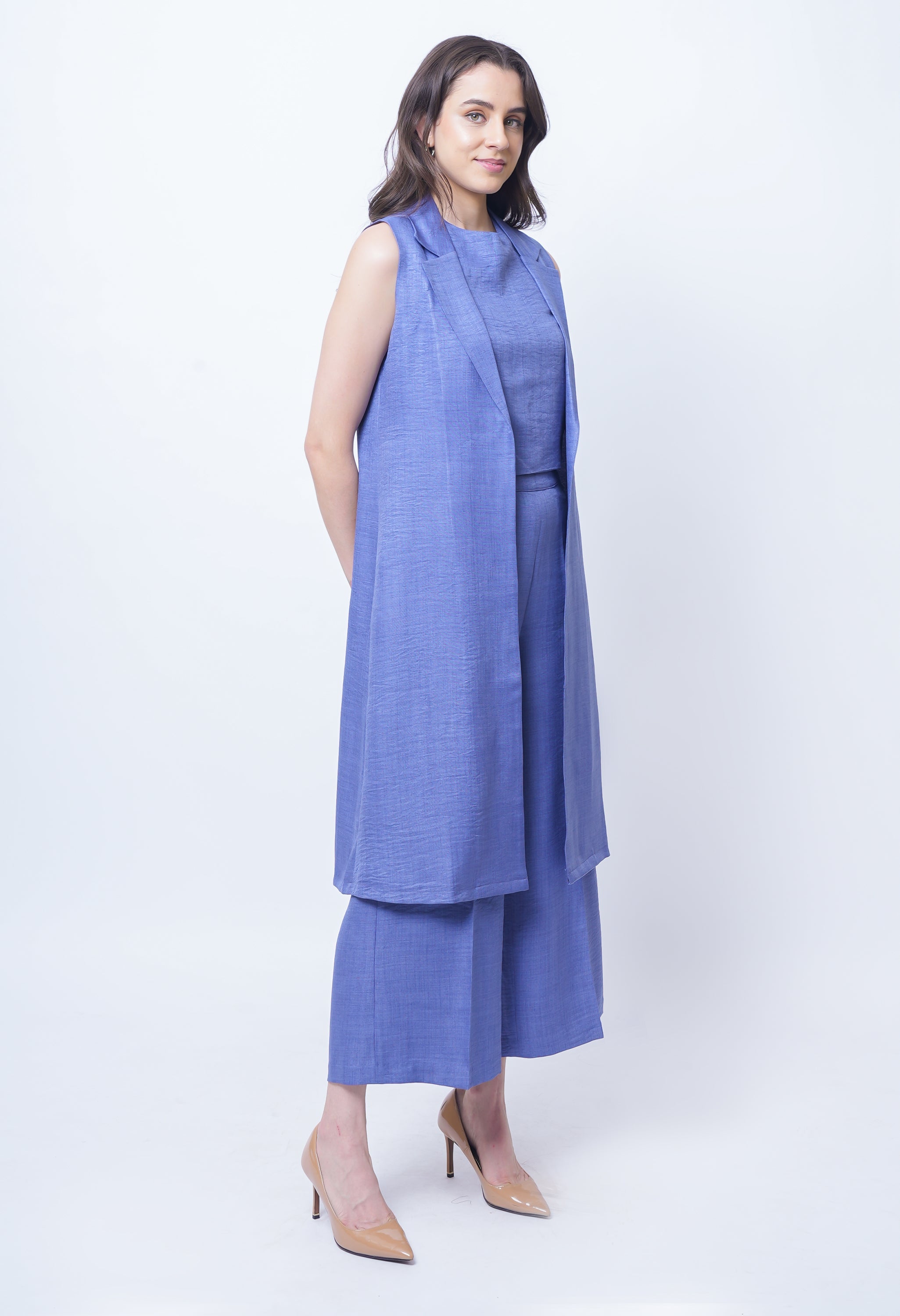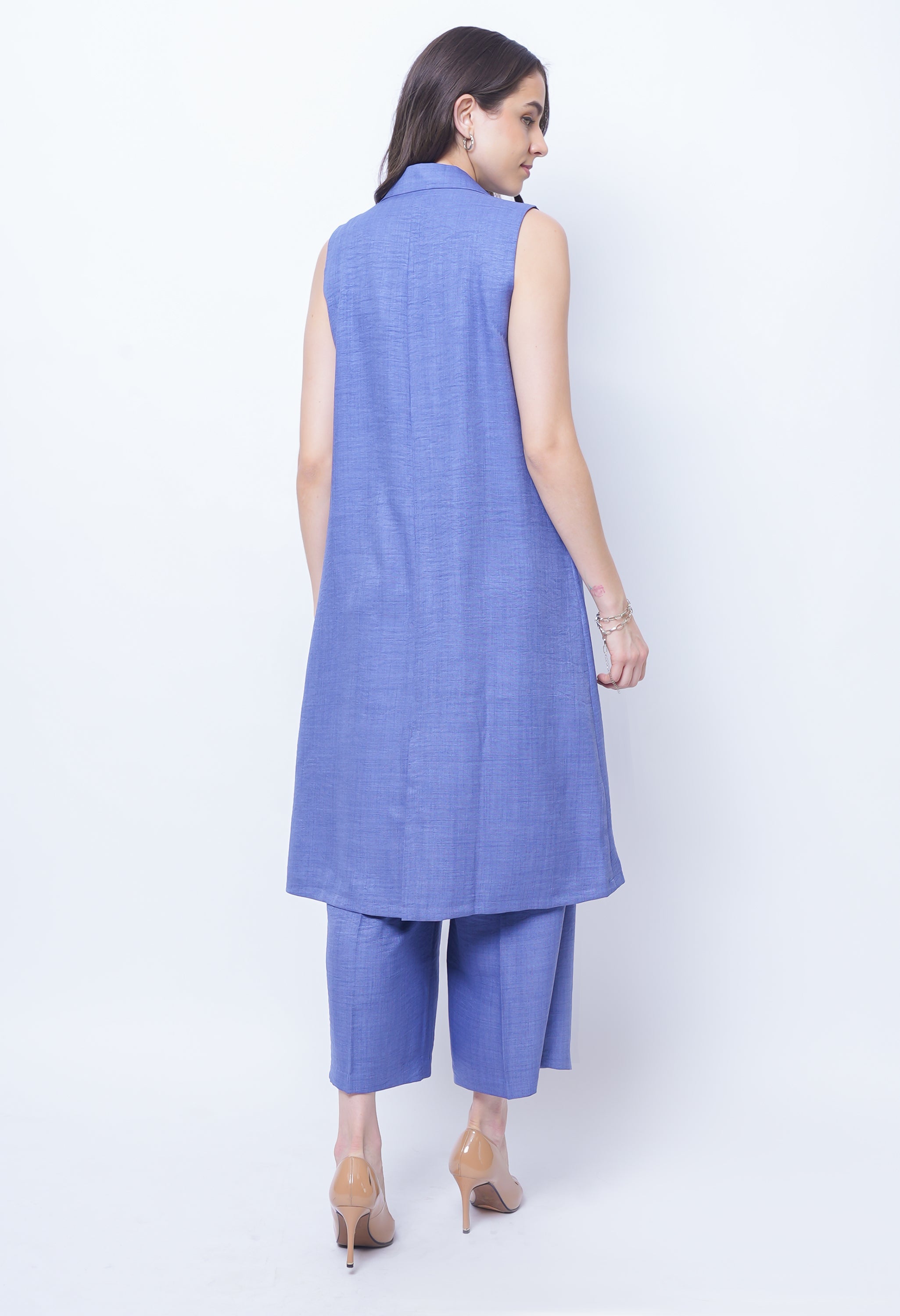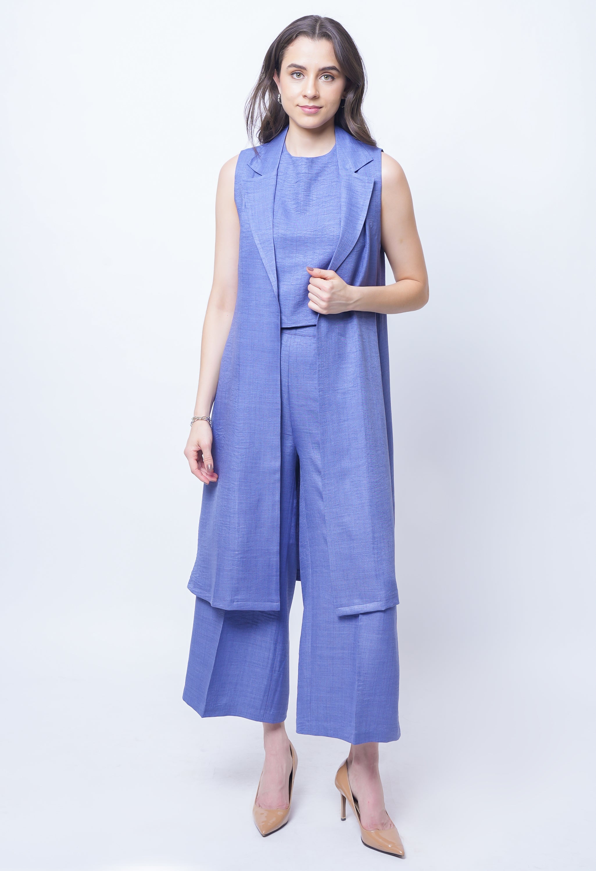 Redefine evening elegance with the Exude Lustrous Long Jacket Coord Set in premium linen. Featuring a flowing long jacket with a sleek finish, this set brings effortless sophistication to modern dressing. The versatile inner top offers a refined foundation, while the wide-leg linen trousers create a graceful, elongated silhouette. Designed with precision tailoring and fluid movement in mind, it strikes the perfect balance between comfort and high-fashion allure. Perfect for elevated day events or evening occasions, this set ensures you make a lasting impression.