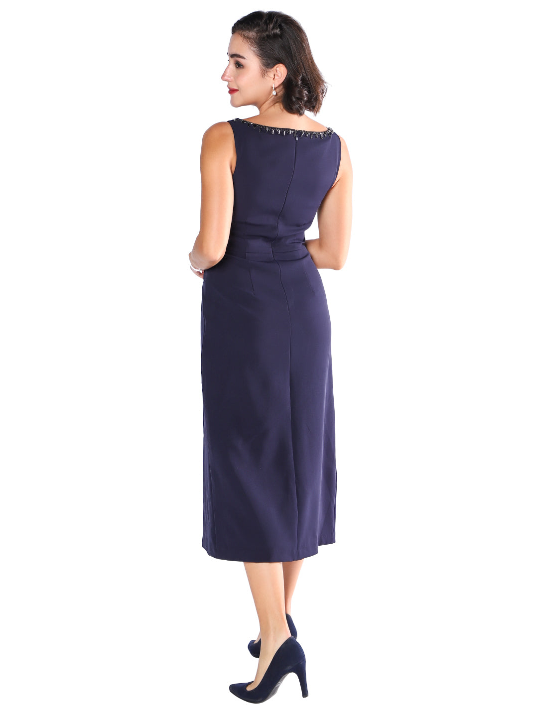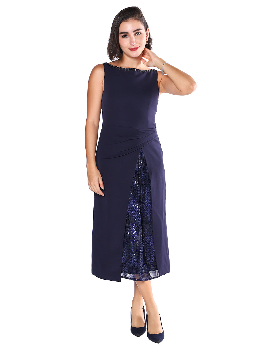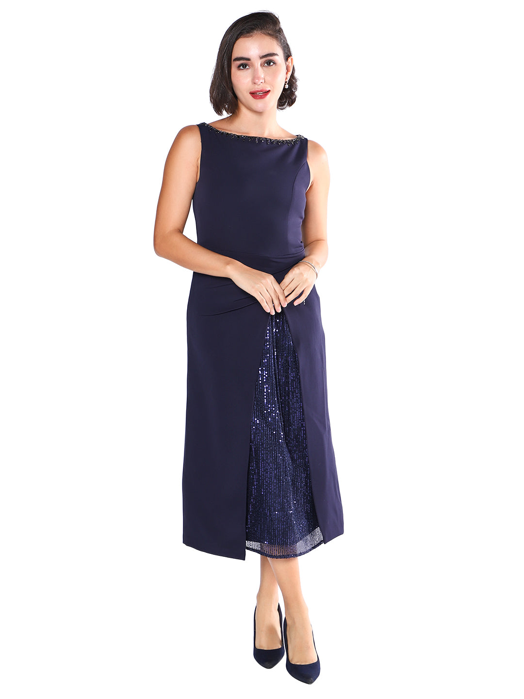 Dazzle with understated sophistication in the Midnight Allure Sequin Slit Dress. Crafted from premium Marina fabric and lined with luxurious Ultra Satin, this sleeveless dress captures the essence of timeless evening elegance.