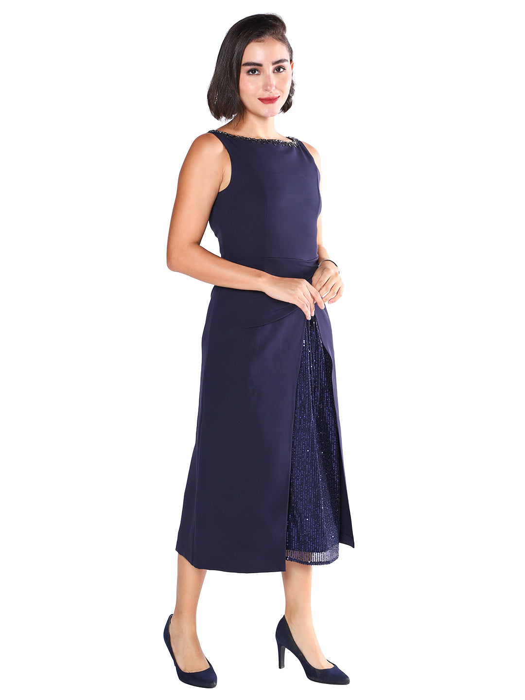 The design features a sleek, structured bodice that flows into a front overlap slit, revealing a stunning sequin-embellished underlayer that shimmers with every step. The subtle neckline detailing adds a touch of grace, making it the perfect choice for cocktail parties, receptions, or elegant dinners.