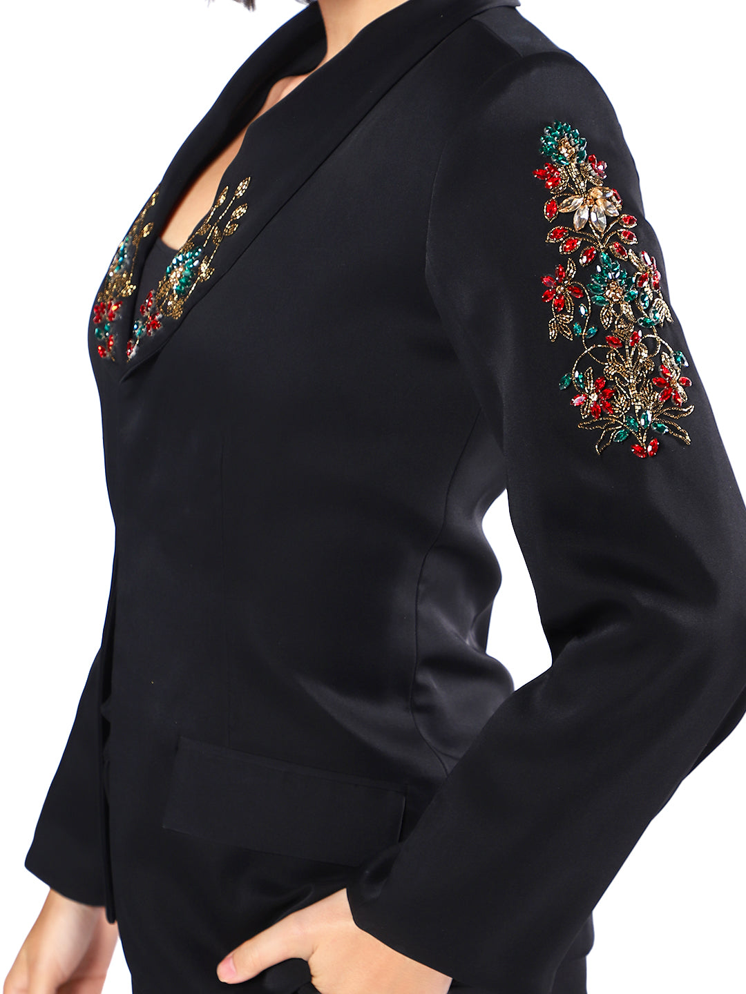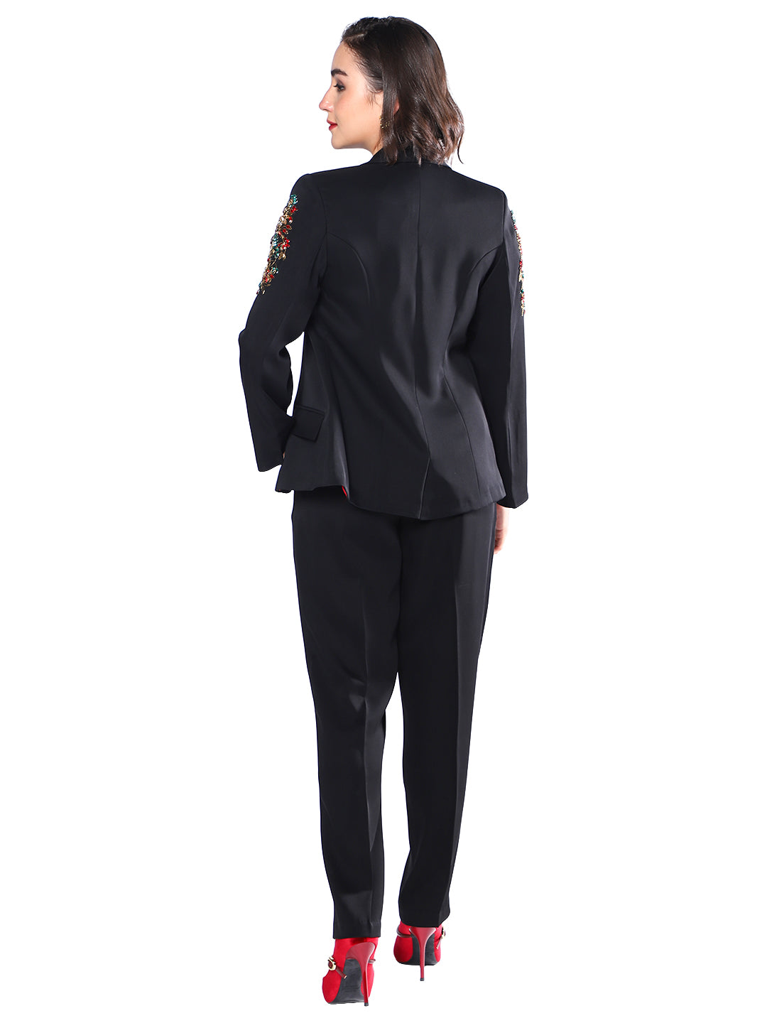 Command the spotlight in the Noir Blossom Embroidered Pantsuit. This tailored black set stands out with artful floral embroidery on the blazer’s shoulders and front seams, combining traditional elegance with contemporary sophistication. The ensemble includes matching straight-leg trousers, promising a flattering, confident silhouette for office, events, or chic evenings out. Pair it with bold heels for a high-impact, polished look every time.