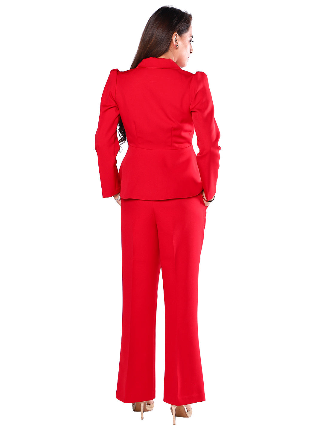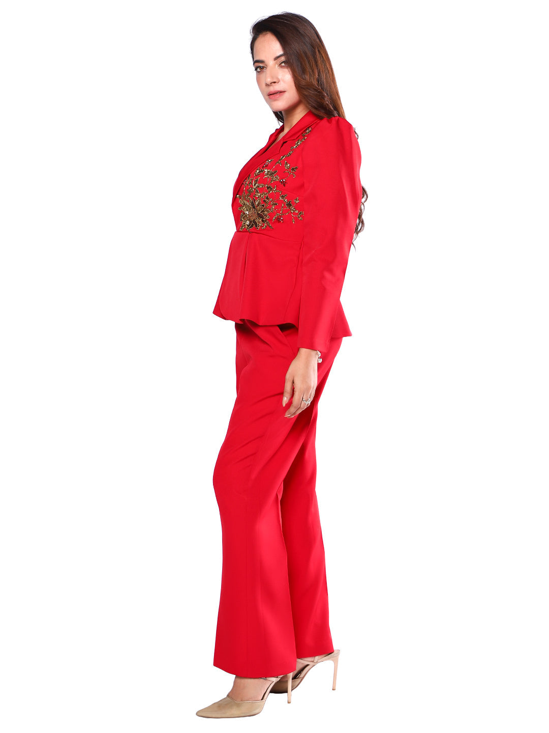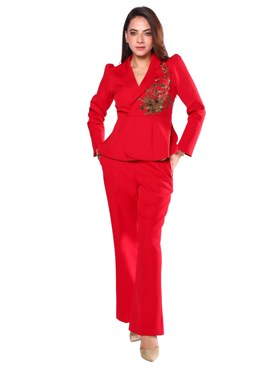 Turn heads with the Scarlet Bloom Embroidered Blazer Set, a perfect fusion of sophistication and style. Crafted from premium Marina fabric with a luxurious Ultra Satin lining, this blazer set ensures comfort without compromising elegance. The highlight of this piece is the intricate gold floral embroidery that adds a regal charm to your look. Tailored with a structured silhouette and peplum-style waist, it flatters every body type and transitions seamlessly from formal gatherings to evening events.