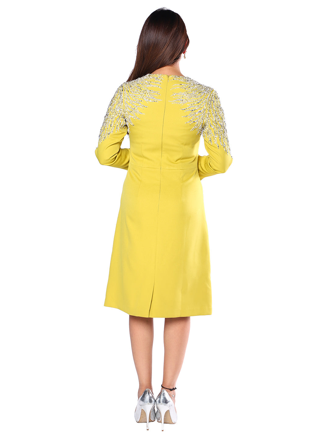 Bask in understated luxury with the Exude Soleil Grace Hand-Embroidered Dress, a statement piece crafted for those who appreciate artistry and elegance. Made from smooth marina fabric and lined with soft poly crepe, it offers both structure and comfort. The highlight of this masterpiece lies in its intricately hand-embroidered sleeves - shimmering details that elevate the dress into a timeless work of art. Designed with a flattering V-neckline and graceful midi length, it transitions seamlessly from day events to refined evenings. A symbol of modern femininity and radiant poise, this dress is made to make you shine effortlessly.
