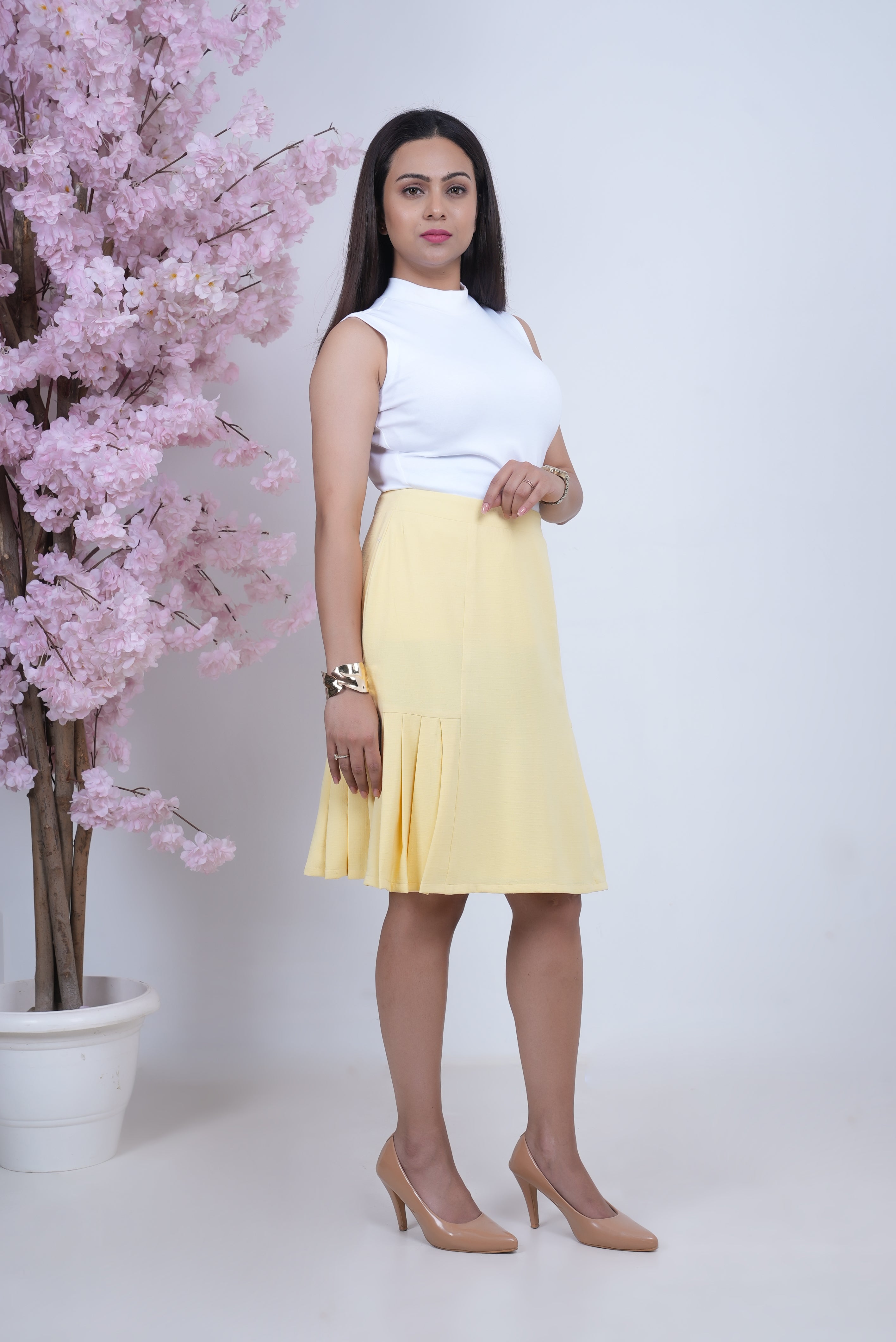 Soft in color, structured in silhouette—this butter yellow A-line skirt is designed with a gentle fit around the thighs to enhance shape while maintaining ease. Made from a breathable lightweight linen blend, it offers a flattering, comfortable fit that moves effortlessly from day to evening. A sunshine-ready staple with quiet sophistication.