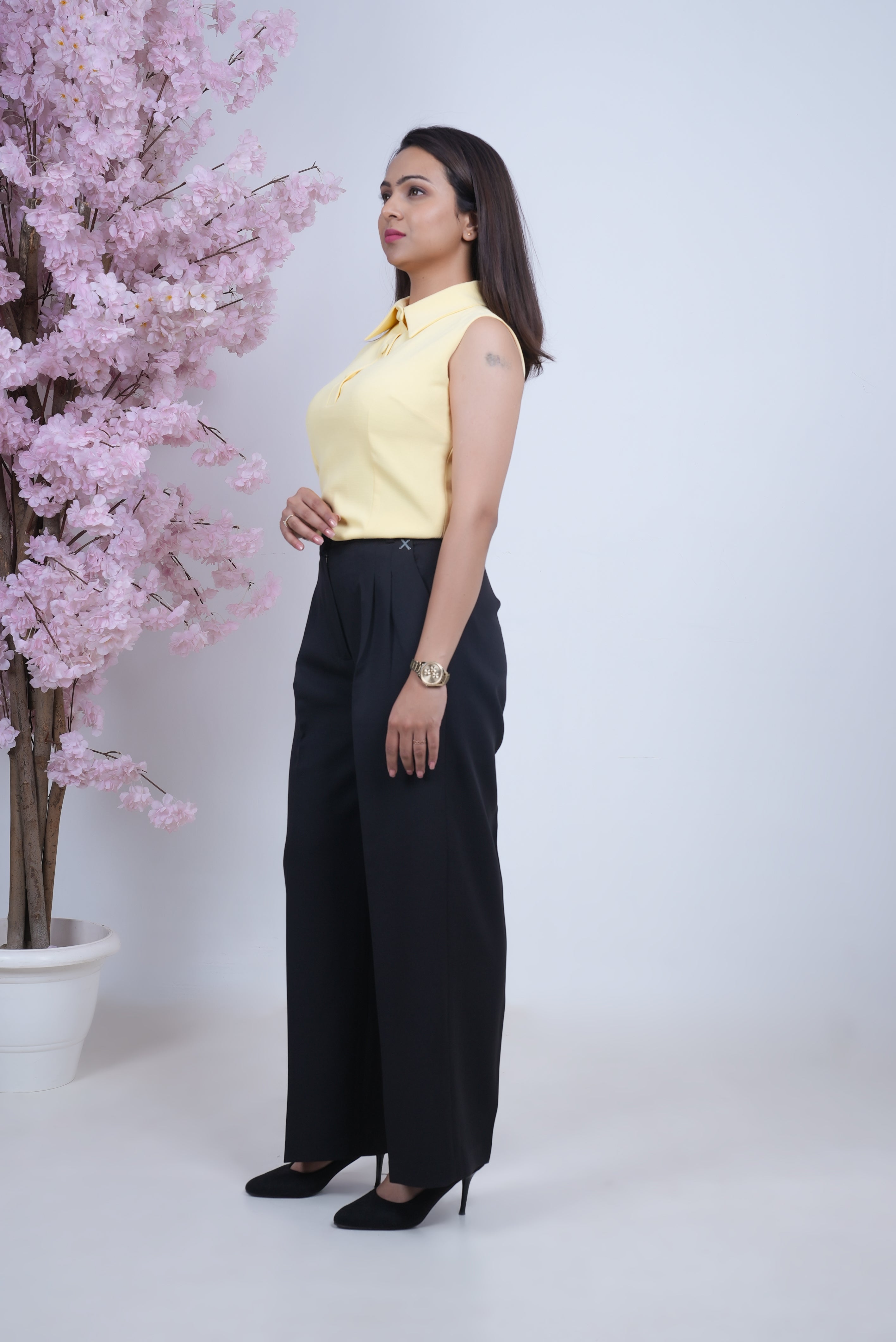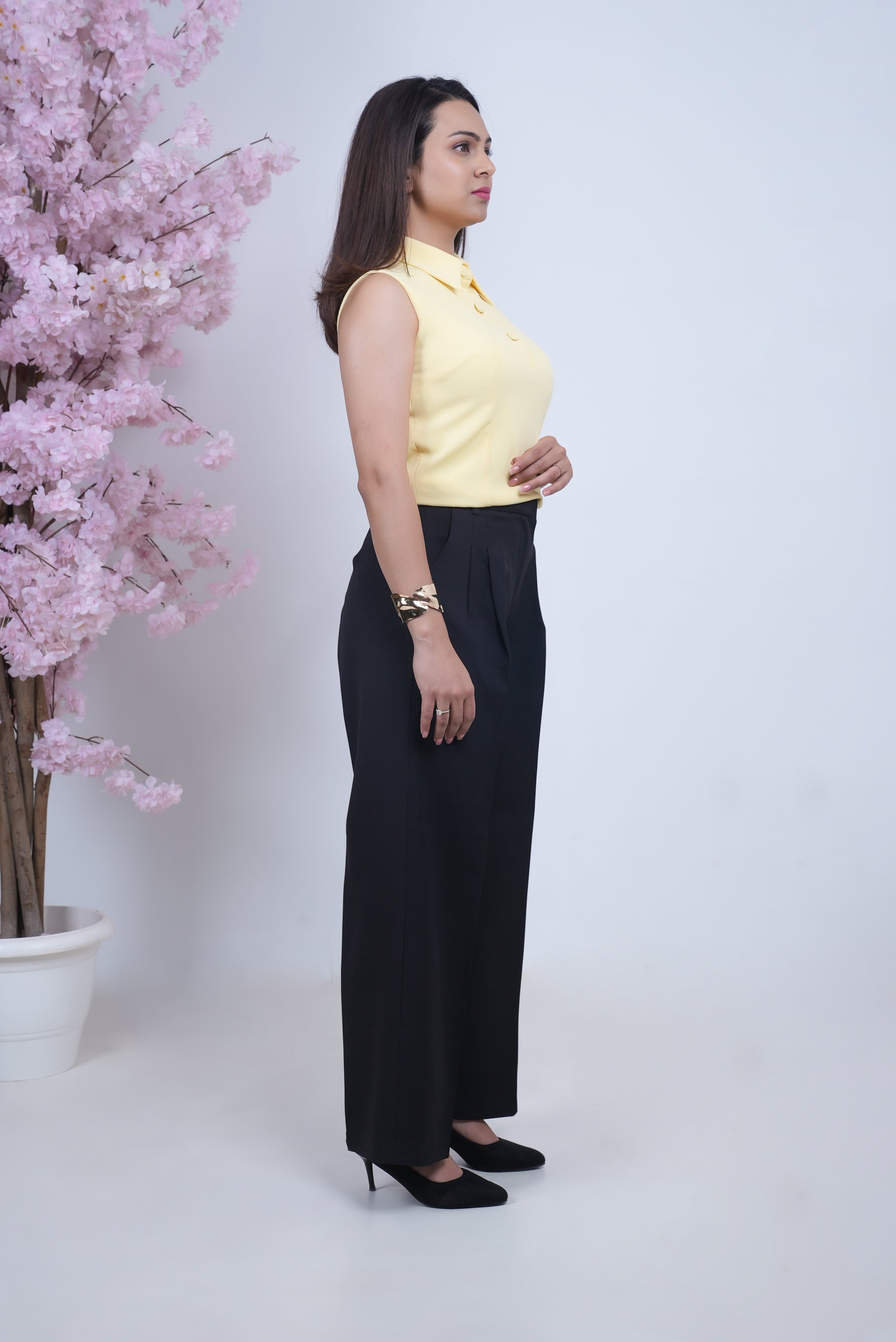 Soft and sunlit, this butter yellow sleeveless top is crafted from breathable linen for a naturally easy feel. Featuring a sharp collar and delicate button detailing, it blends structure with softness for a polished yet relaxed look. Perfect for pairing with skirts, trousers, or layering under a blazer on warm days.