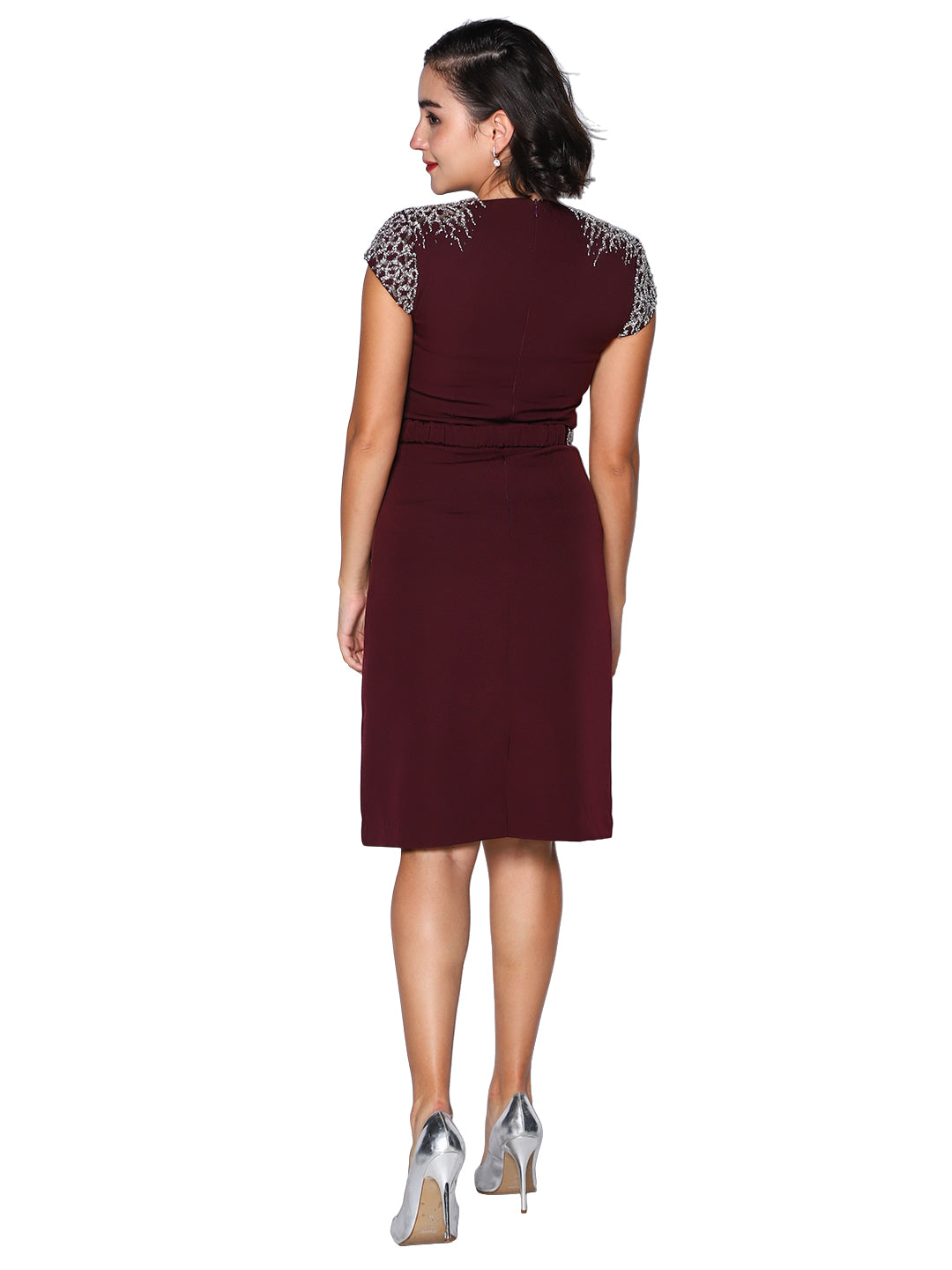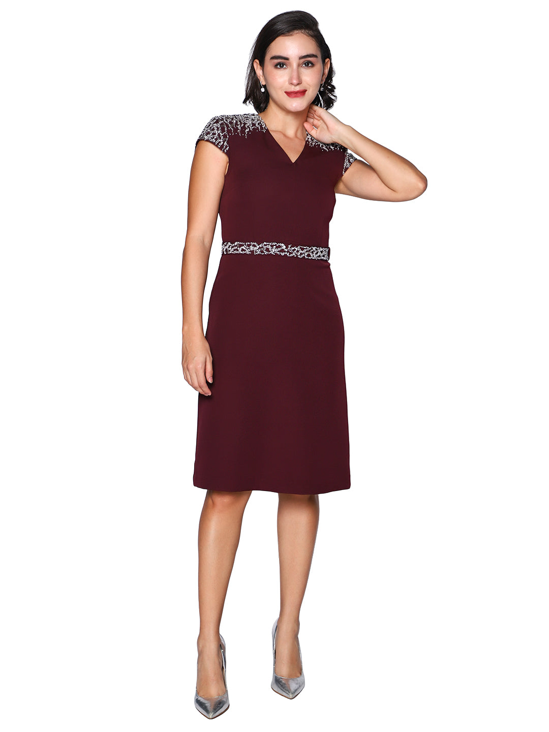 Turn heads in our Wine Grace Embellished Midi Dress, designed for the modern woman who appreciates timeless elegance. This deep wine-hued dress features a flattering V-neckline, cap sleeves adorned with delicate silver embellishments, and a matching embellished waist detail that defines the silhouette beautifully. Perfect for evening events, formal gatherings, or cocktail parties, this dress blends simplicity with refined glamour.
